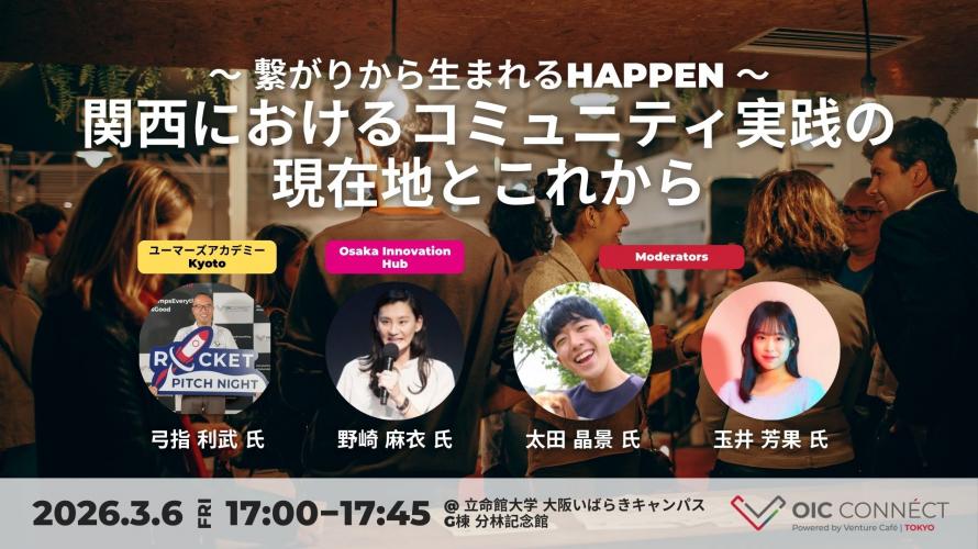 The next OIC CONNÉCT will be held on Friday, March 6th! OIC CONNÉCT is an innovation community program organized by Ritsumeikan and Venture Café Tokyo at Ritsumeikan University Osaka Ibaraki Campus (OIC). This time, we present “KANSAI COMMUNITY NIGHT – NEXT CHAPTER -,” a night starting from OIC CONNÉCT to look back on the journey of community in Kansai, the events born from it, and what lies ahead! We look forward to seeing you there.