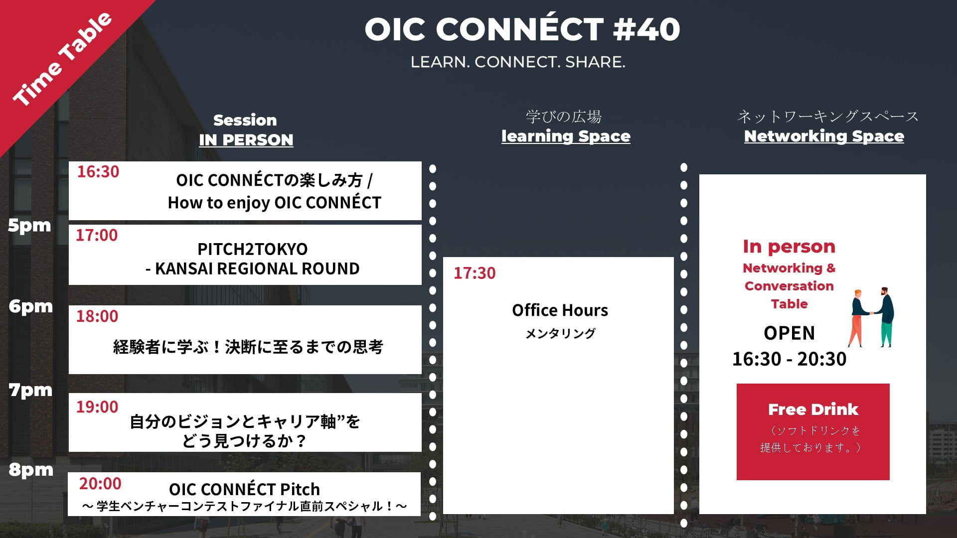 We will introduce the unique vision and atmosphere of OIC CONNÉCT and Venture Café Tokyo. Additionally, we’ll share some tips and simple guidelines to help everyone feel comfortable and enjoy connecting with each other in a relaxed and friendly manner. If this is your first time joining OIC CONNÉCT, be sure to check it out!