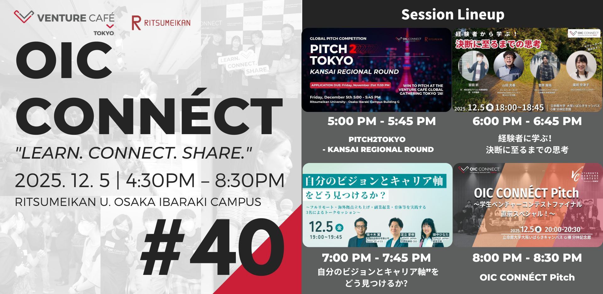 2025年12月5日(金)、立命館とVenture Café Tokyoが立命館大学大阪いばらきキャンパス(OIC)で開催する、誰もが無料で参加可能なイノベーションコミュニティプログラム「OIC CONNÉCT #40」を開催します!起業家や何か新たなチャレンジを模索する人、研究者、投資家、学生、会社員等、挑戦やイノベーションに少しでも興味があれば「誰でも」参加可能です。