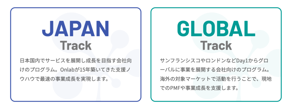従来の日本での成長支援を行うJAPAN Trackに加え、GLOBAL Trackでは、サンフランシスコにあるインキュベーションセンターや、様々なグローバルネットワークを活用し、スタートアップの世界展開をDay 1からサポートします。