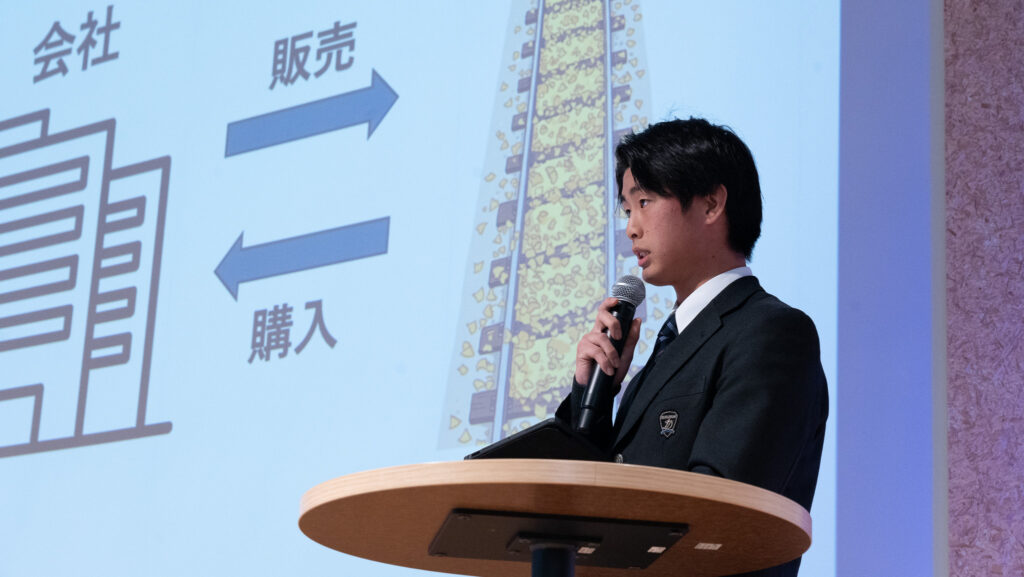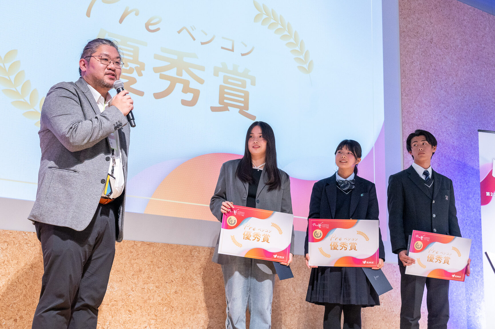 最初に、昨年度から新たに開催した、全国の高校生を対象とした未来の豊かな暮らしや社会を作るためのアイデアとチャレンジを競う「Preベンチャーコンテスト」の優秀賞受賞チームによるプレゼンテーションを行いました。プレゼンは学生ベンチャーコンテストと同じく1チーム5分間で行われ、プレゼン後には優秀賞の授与も行われました。