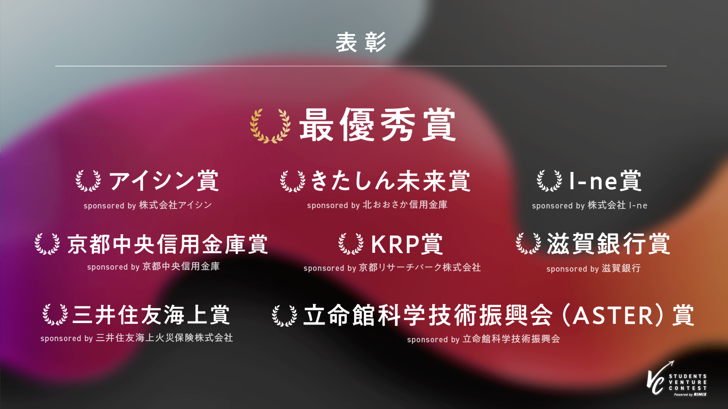 6組のファイナリストが披露したピッチに対しては、審査員3名による審査が行われ「最優秀賞」が決定。また、スポンサーの皆様によりご協賛いただき、以下の協賛企業賞が授与されました。